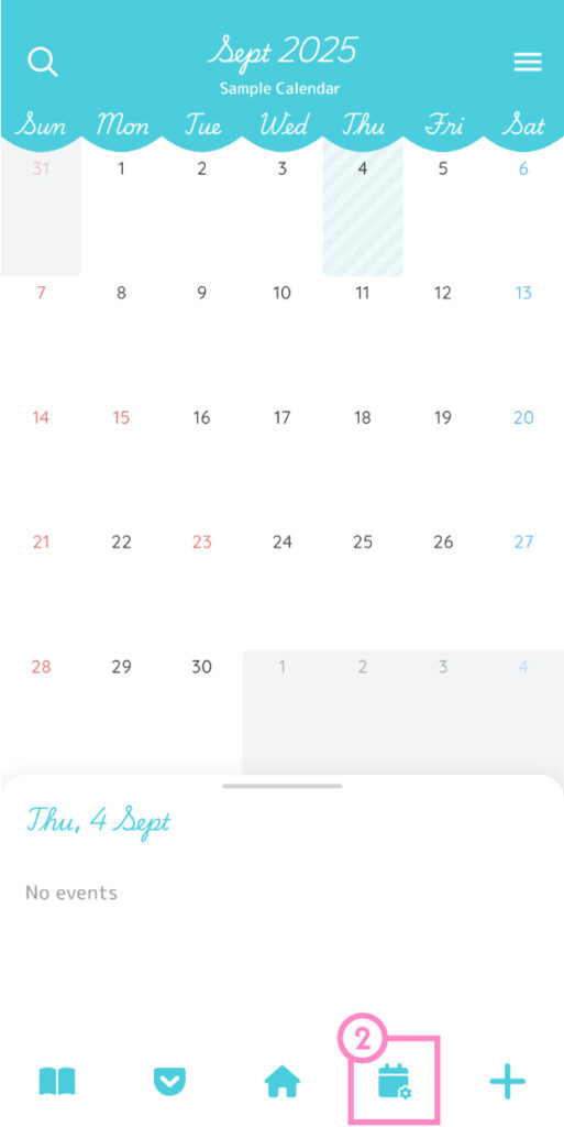② On the calendar screen, tap the second icon from the right at the bottom to open Calendar Settings.