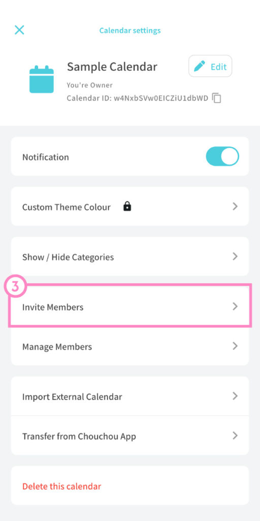 ③ In the Calendar Settings screen, tap “Invite Members.”