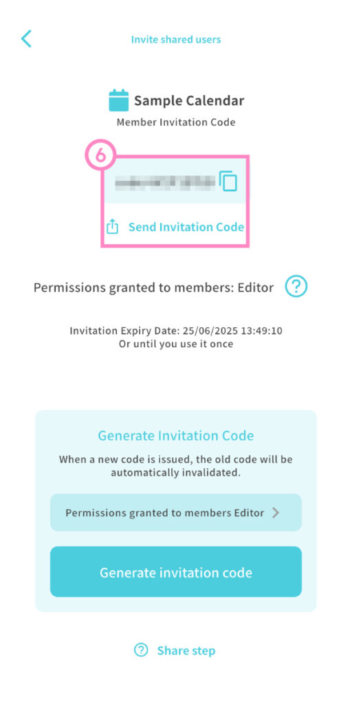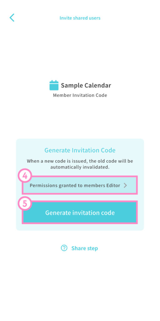 ④ Choose the permission level you’d like to give the member. ⑤ Tap “Generate Invitation Code.”