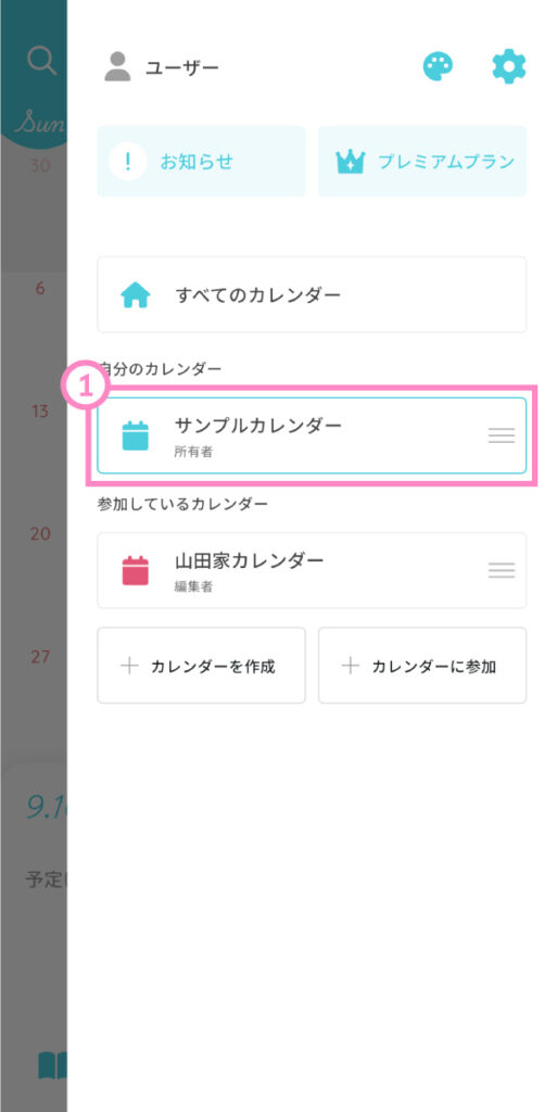 ① メニュー画面から、権限を変更または削除したいメンバーのいるカレンダーを選びます。