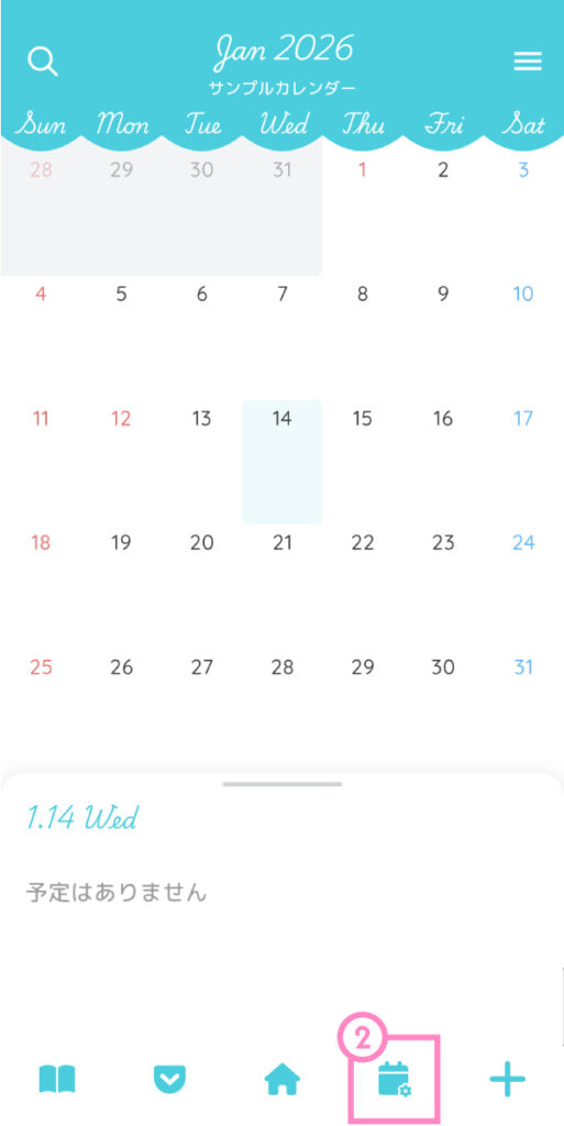 ② カレンダー画面下部の右から2番目のアイコンをタップして「カレンダー設定画面」を開きます。