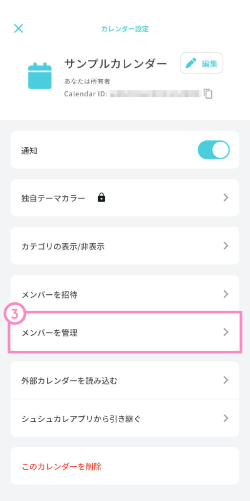 ③ カレンダー設定画面で、「メンバーを管理」をタップします。