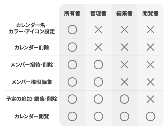 カレンダーを所有しているユーザーが「所有者」、カレンダーにメンバーを招待する際に付与できる権限「管理者」「編集者」「閲覧者」と合わせて4種類です。