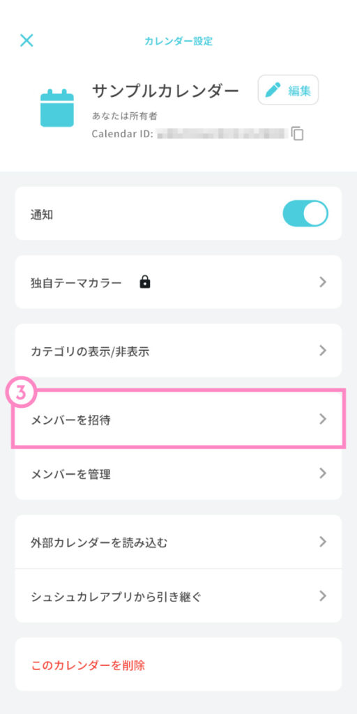 ③ カレンダー設定画面で、「メンバーを招待」をタップします。