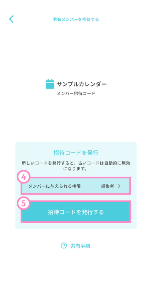 ④ 招待したいメンバーに与える権限を選択し、⑤「招待コードを発行する」ボタンをタップします。
