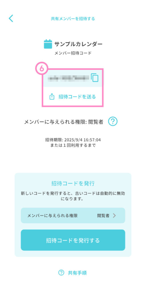 ⑥ 発行された招待コードをコピーして、LINEやメールなどで共有したい相手に送ります。